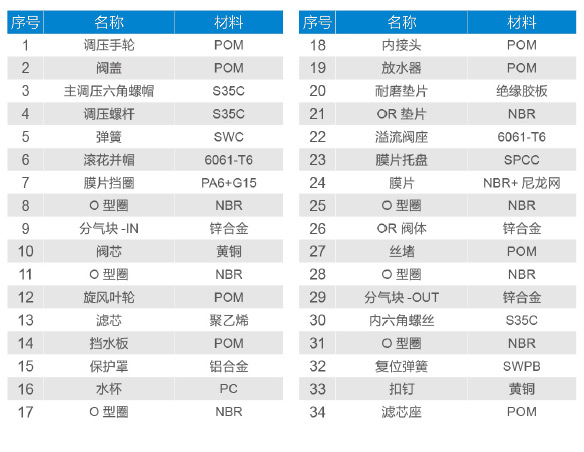 物資信息 | 殼體:壓鑄鋅;過濾杯: PC; 金屬保護罩:鋁合金;密封:丁腈橡膠;調壓手輪: POM |