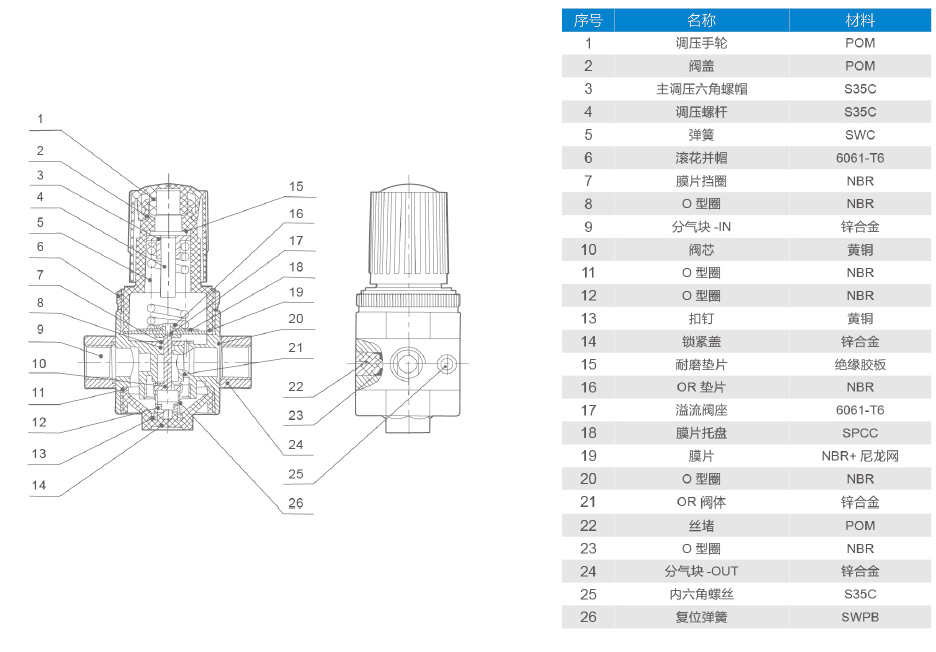 物資信息 | 殼體:壓鑄鋅;密封:丁腈橡膠;調(diào)壓手輪: POM |