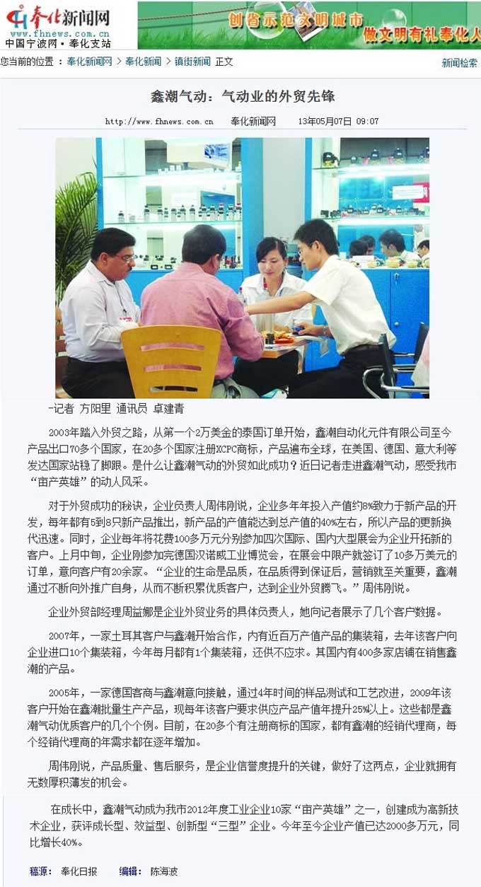 2013年5月,鑫潮氣動被奉化日報,奉化新聞網(wǎng)多家媒體采訪, 我公司目前已經(jīng)成了氣動業(yè)的外貿(mào)先鋒,詳細報道請參考以下鏈接: